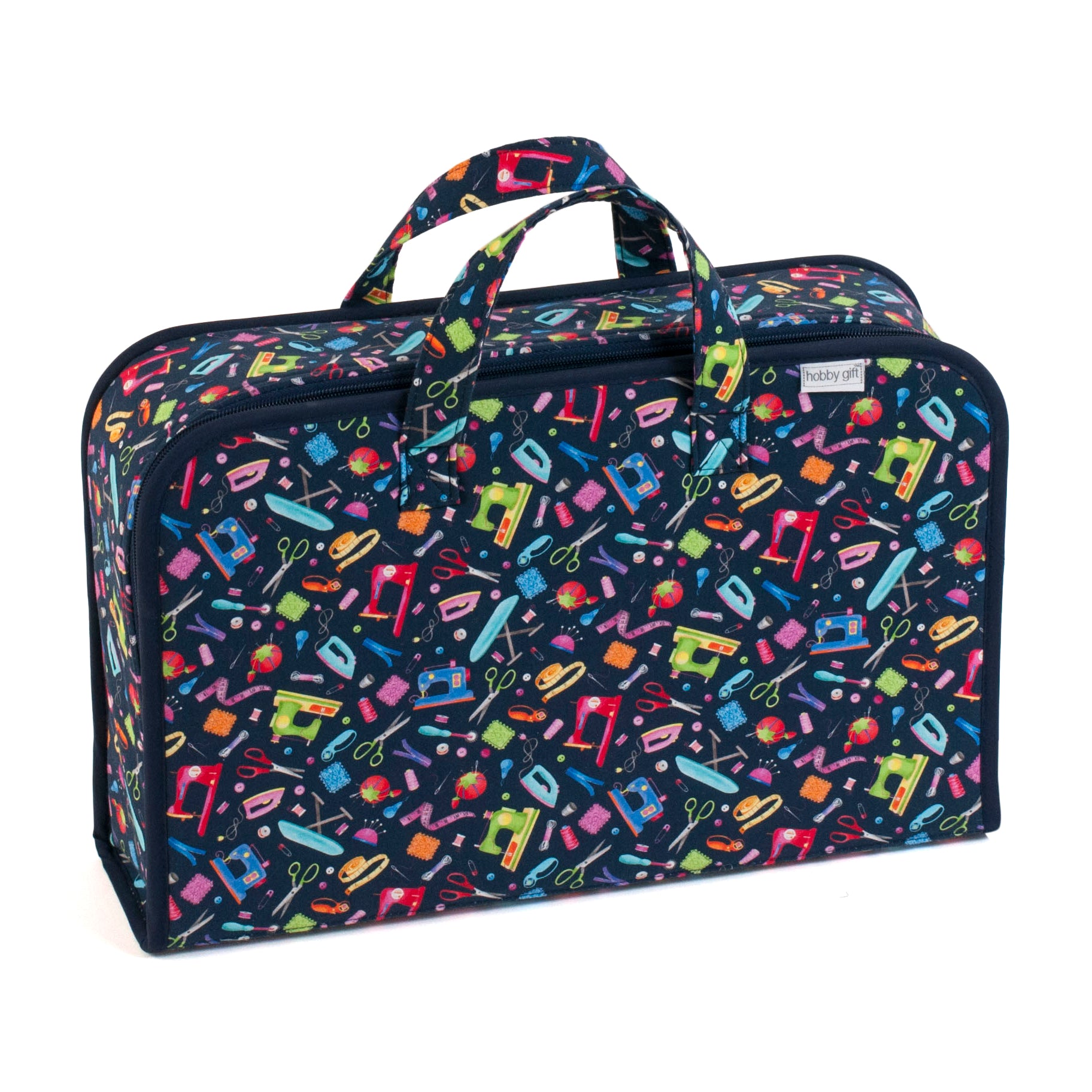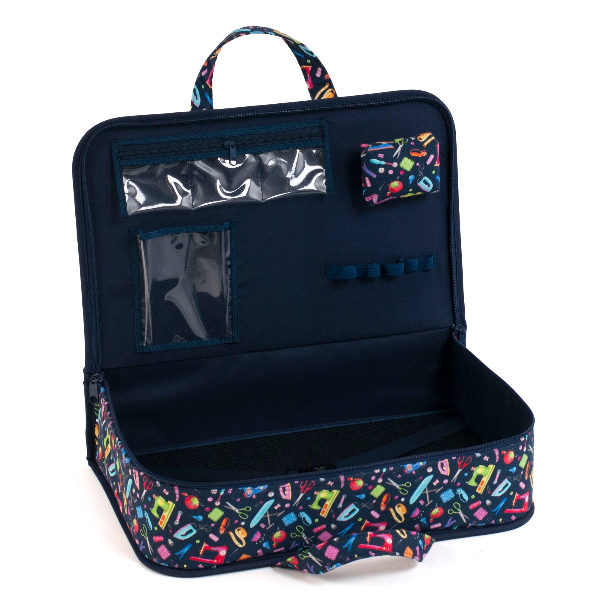 -Zippered project case covered with 100% cotton fabric in a Mini Sew Machines print