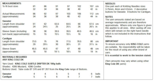 - Please see second image for suggested yarns, needle sizes and quantities required to make the garments