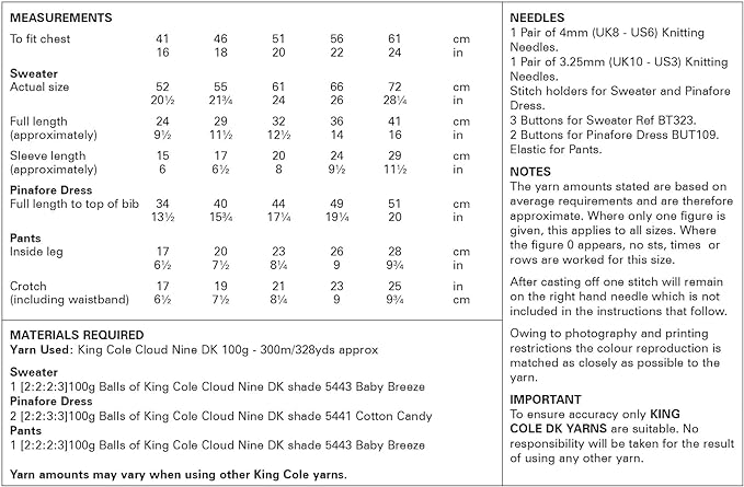 - Please see second image for suggested yarns, needle sizes and quantities required to make the garments