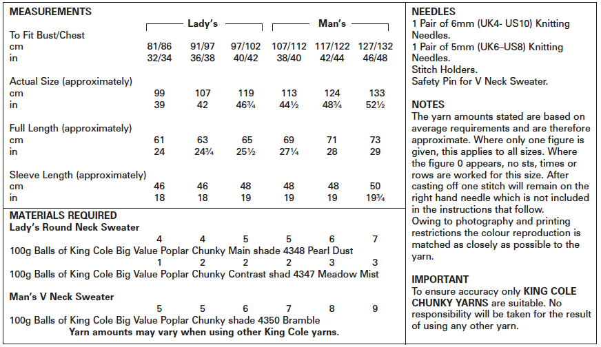 - Please see second image for suggested yarns, needle sizes and quantities required to make the garments