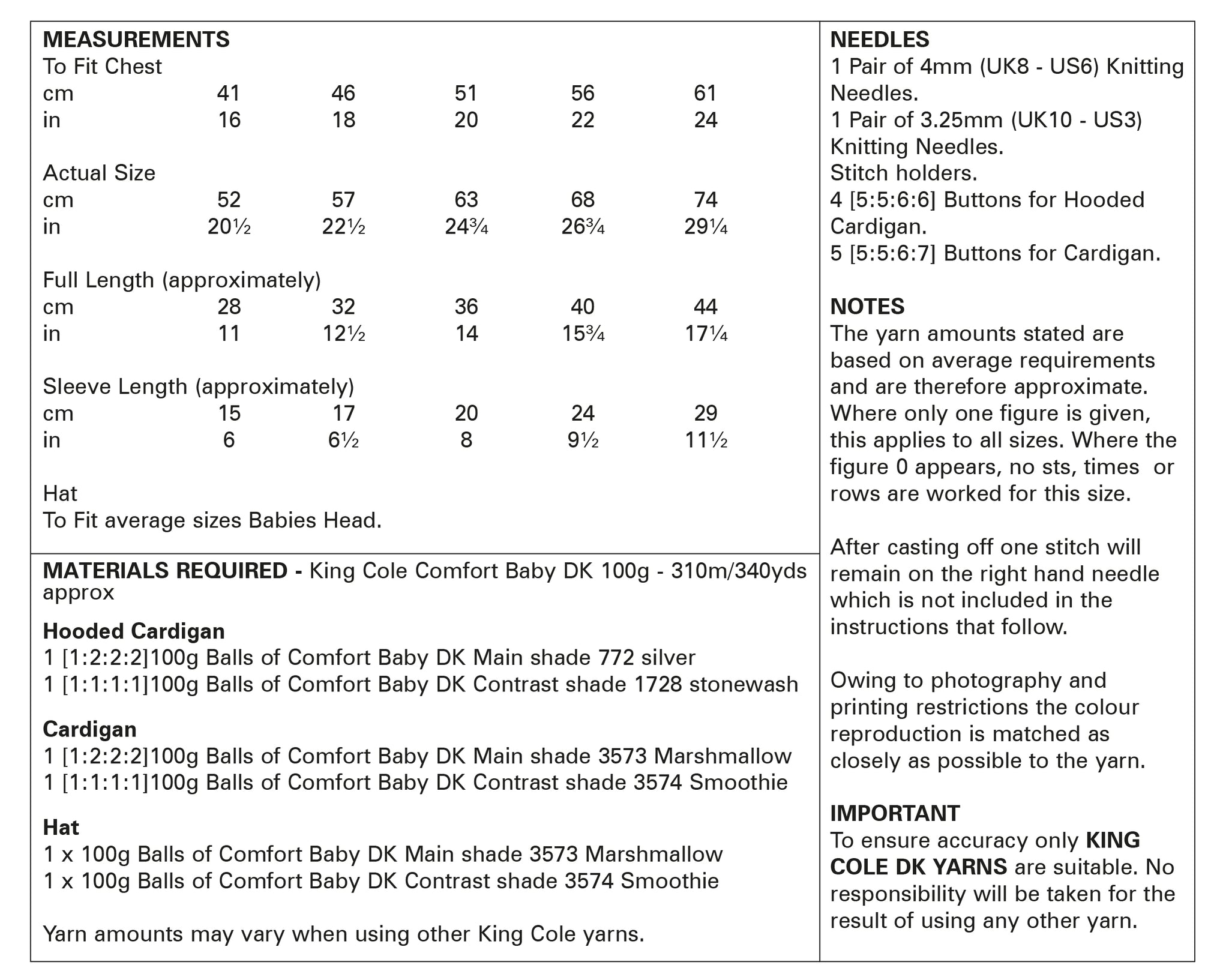 - Please see second image for suggested yarns, needle sizes and quantities required to make the garments