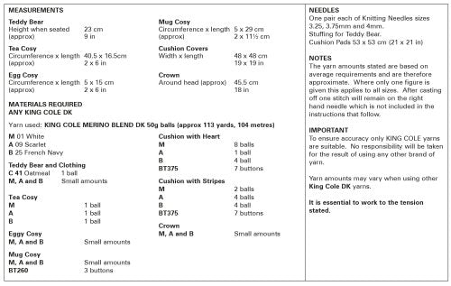 Please see second image for suggested yarns, needle sizes and quantities required to make the garments