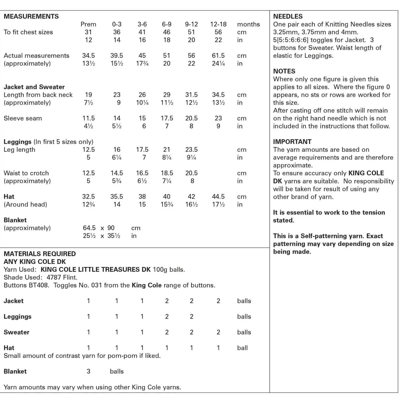 King Cole Pattern Babies Jacket, Sweater, Leggings, Hat & Blanket Knitted in Little Treasures DK 5853