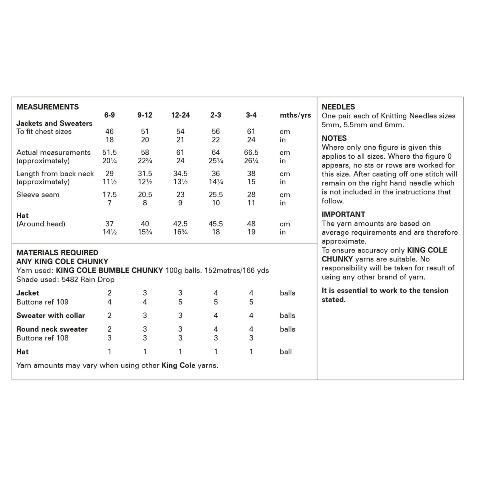 King Cole Pattern Babies Jacket, Sweaters, & Hat Knitted in Bumble Chunky 6083
