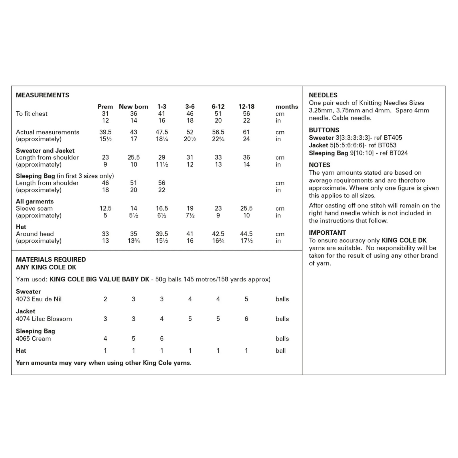 King Cole Pattern Babies Sweater, Jacket, Sleeping Bag and Hat Knitted in Big Value Baby 6212