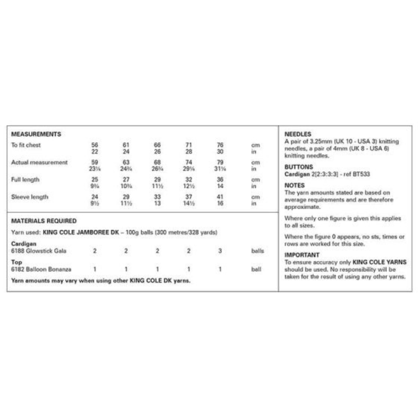 - Please see second image for suggested yarns, needle sizes and quantities required to make the garments