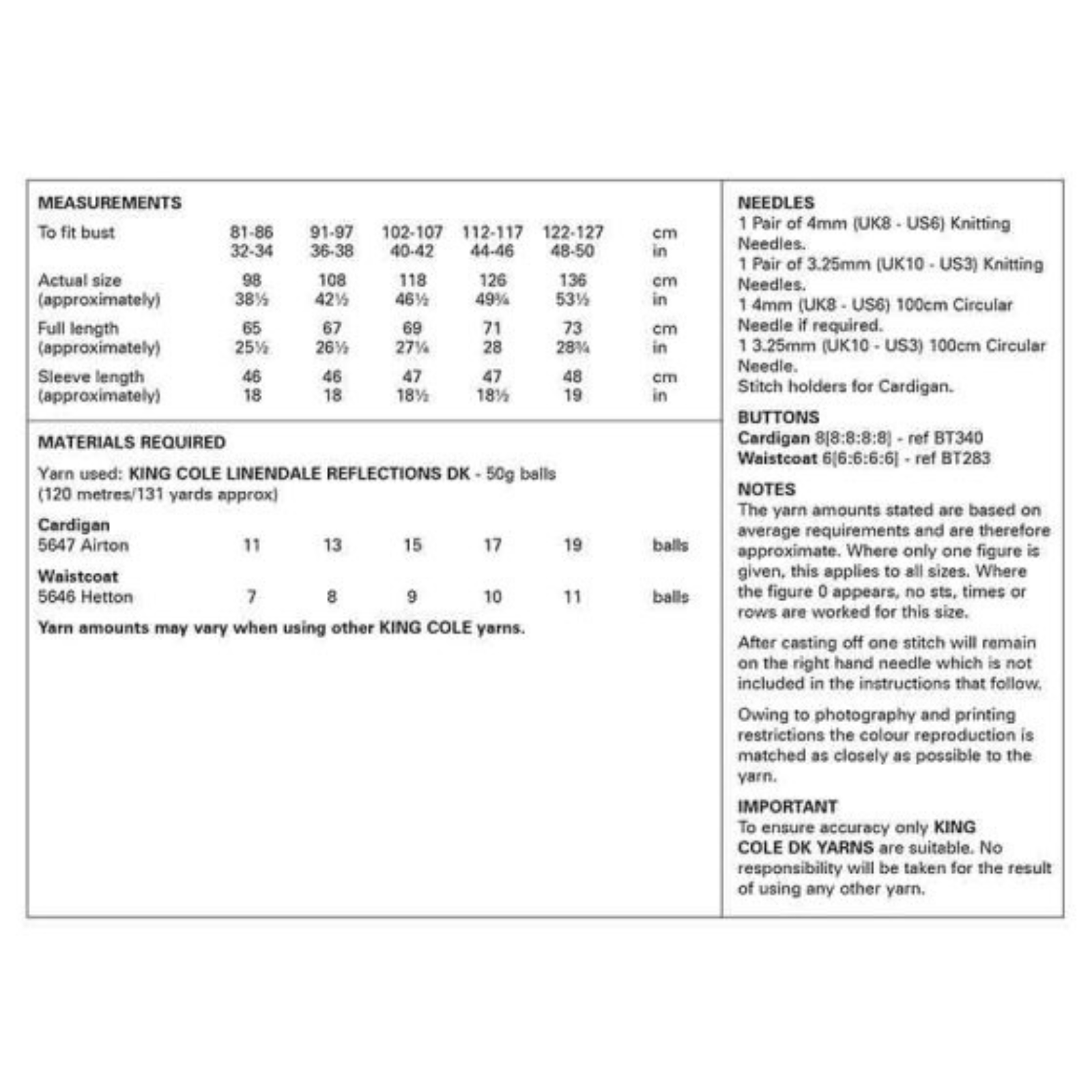 - Please see second image for suggested yarns, needle sizes and quantities required to make the garments