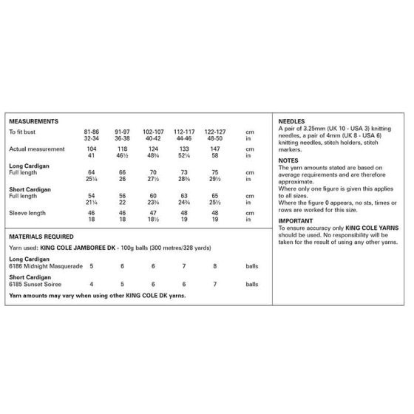 - Please see second image for suggested yarns, needle sizes and quantities required to make the garments