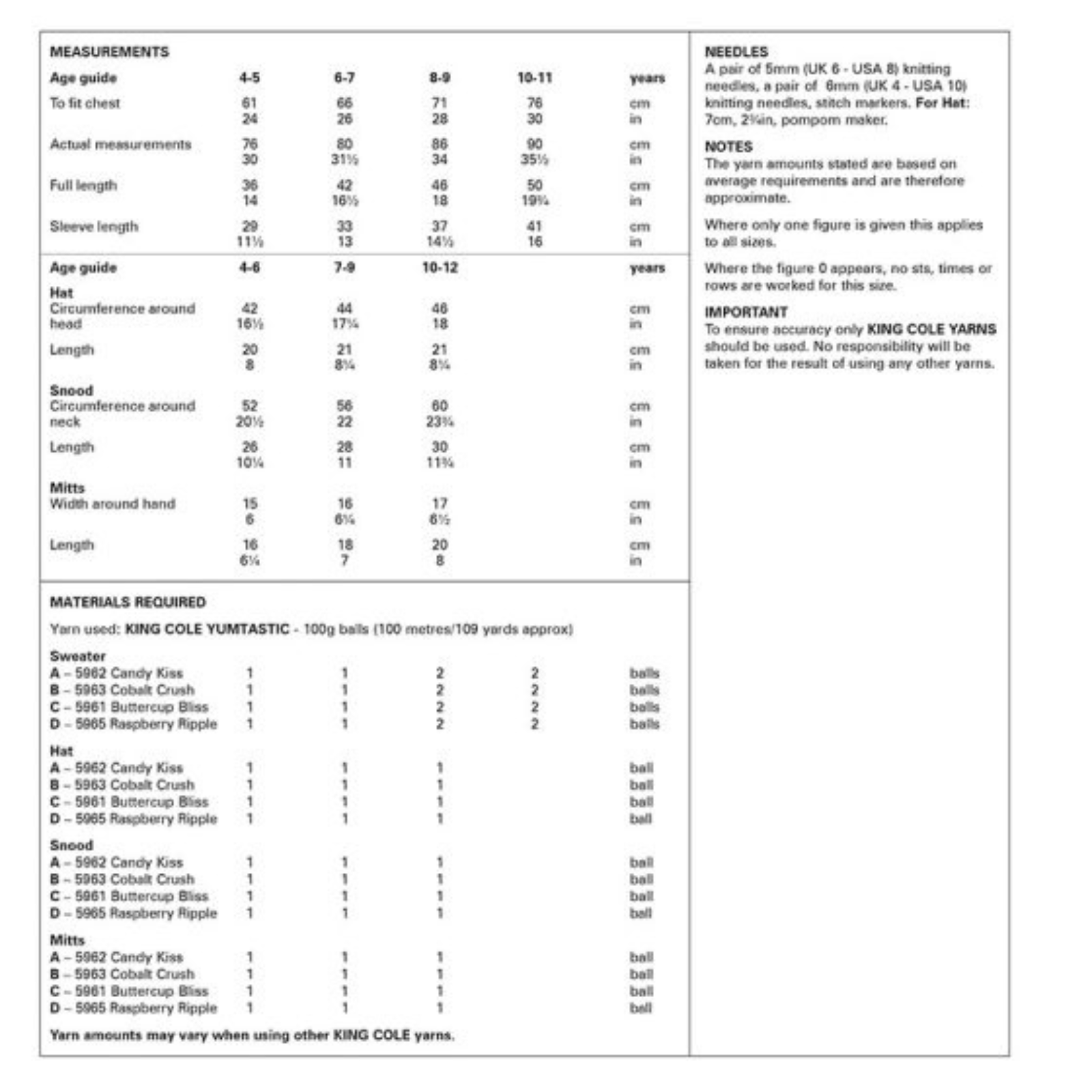 - Please see second image for suggested yarns, needle sizes and quantities required to make the garments