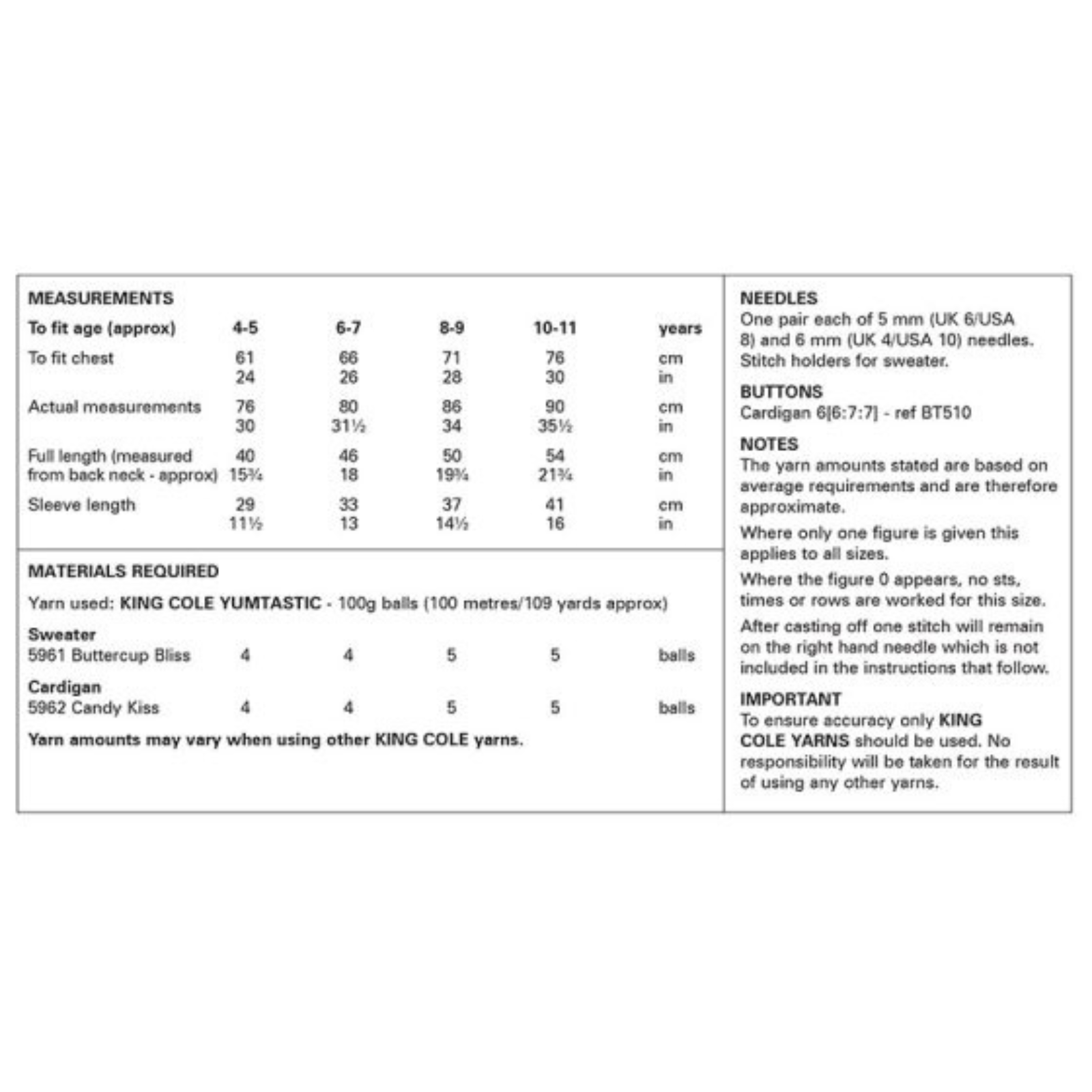 - Please see second image for suggested yarns, needle sizes and quantities required to make the garments