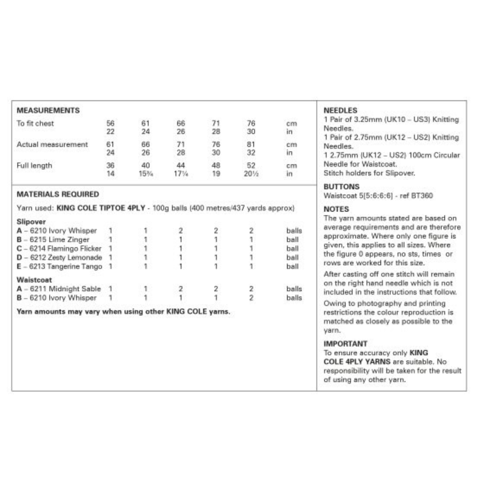 - Please see second image for suggested yarns, needle sizes and quantities required to make the garments