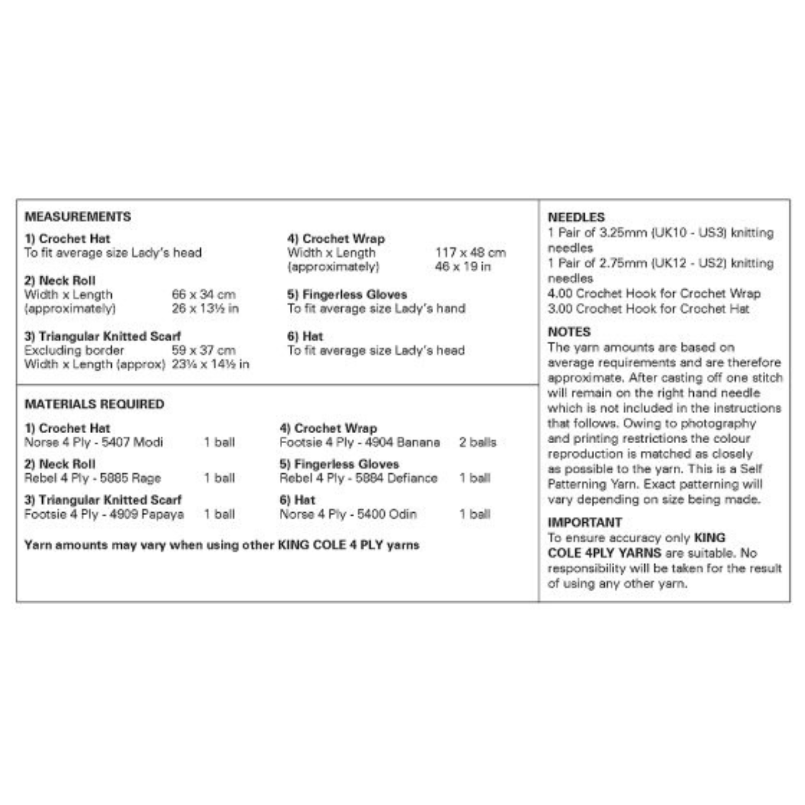 - Please see second image for suggested yarns, needle sizes and quantities required to make the garments