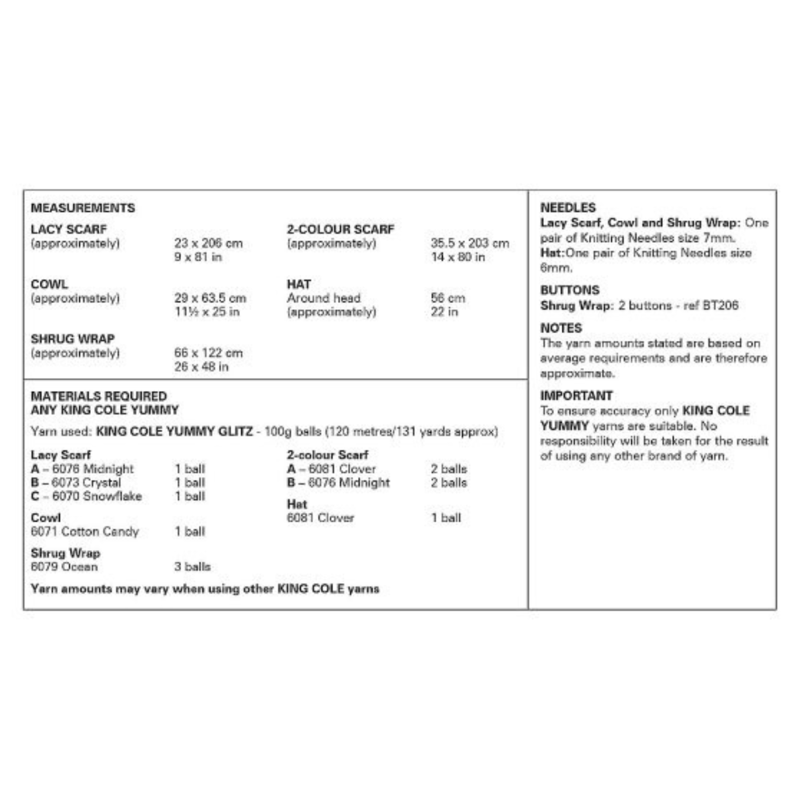 - Please see second image for suggested yarns, needle sizes and quantities required to make the garments