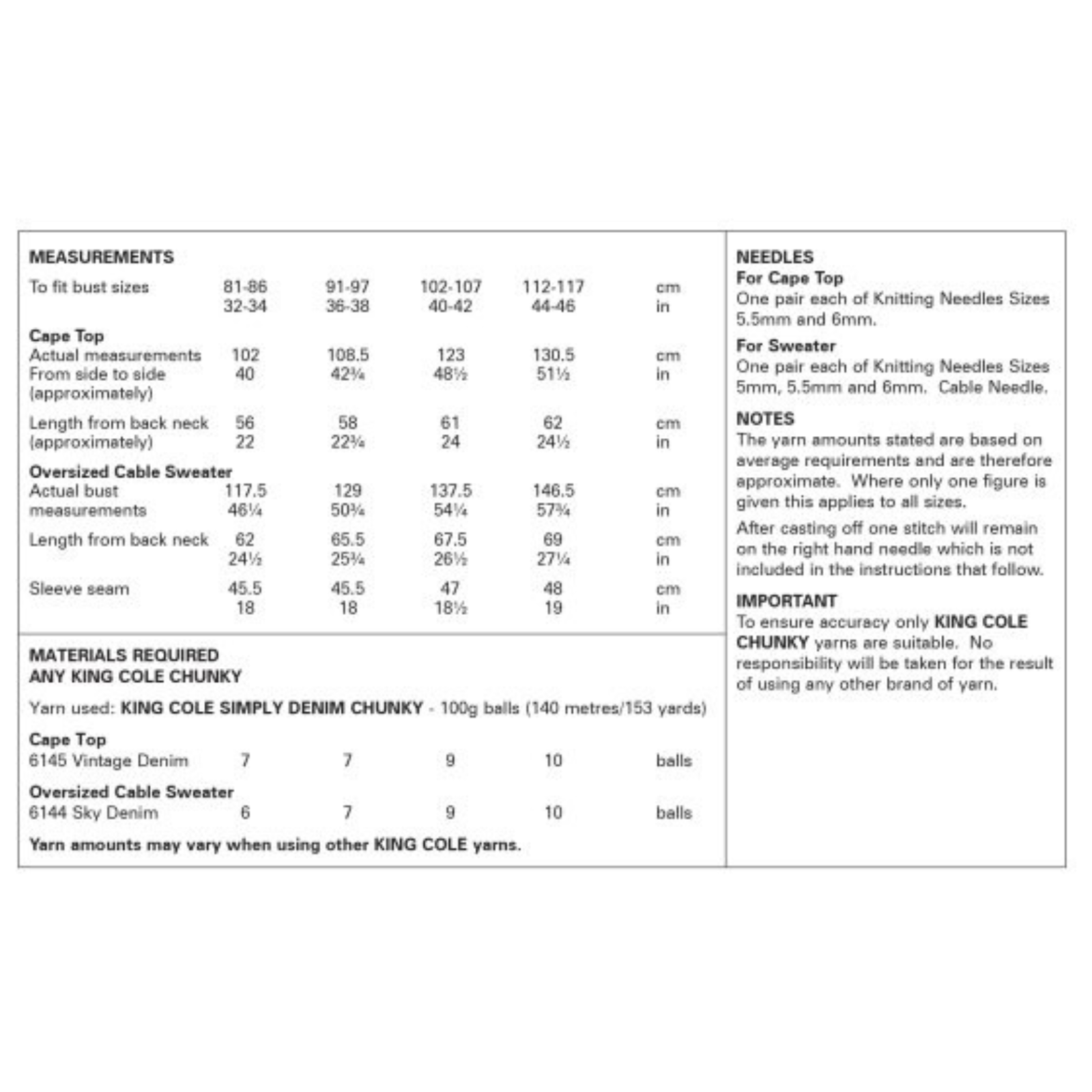 King Cole Pattern Ladies Cape Top and Oversized Cable Sweater knitted in Simply Denim Chunky 6378