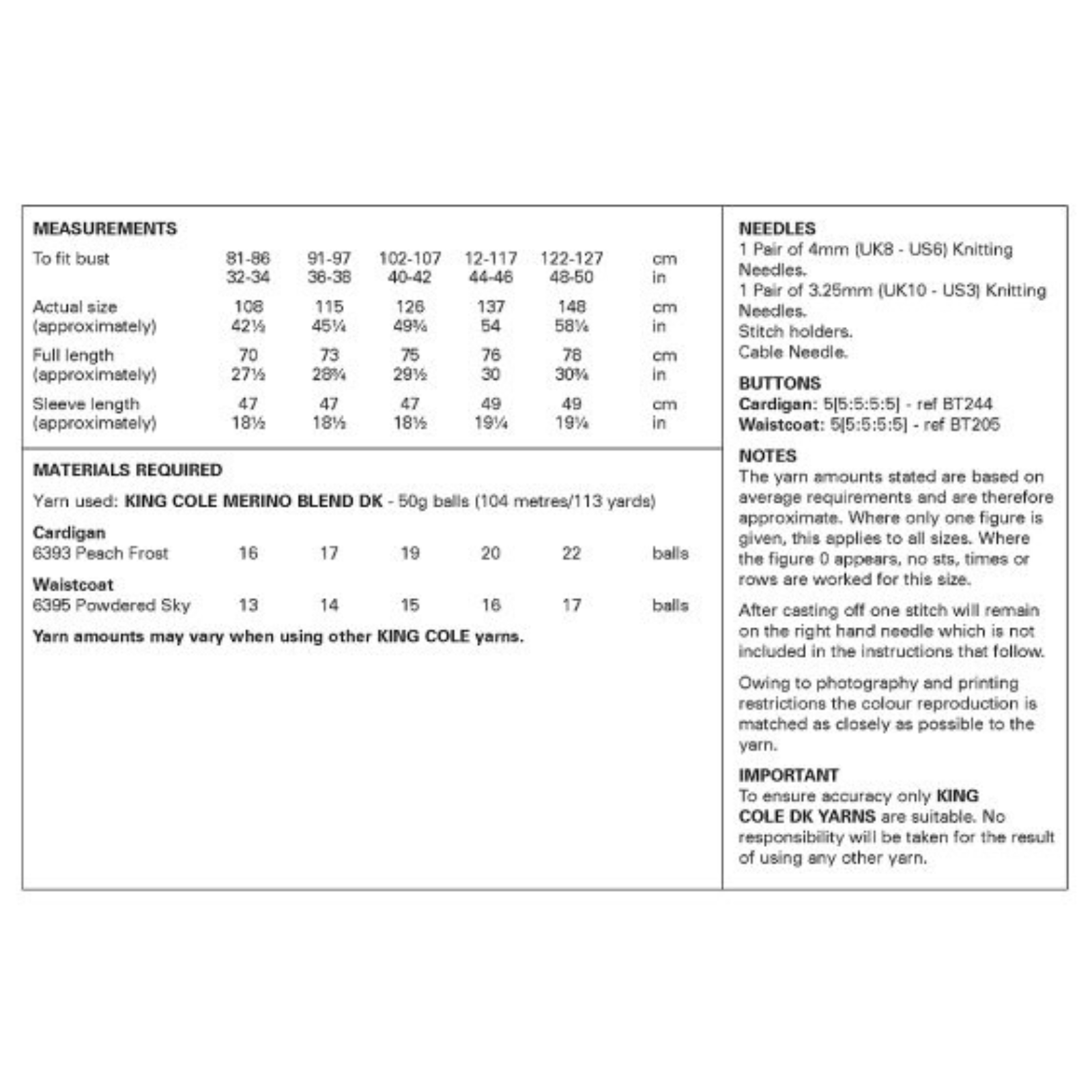 - Please see second image for suggested yarns, needle sizes and quantities required to make the garments