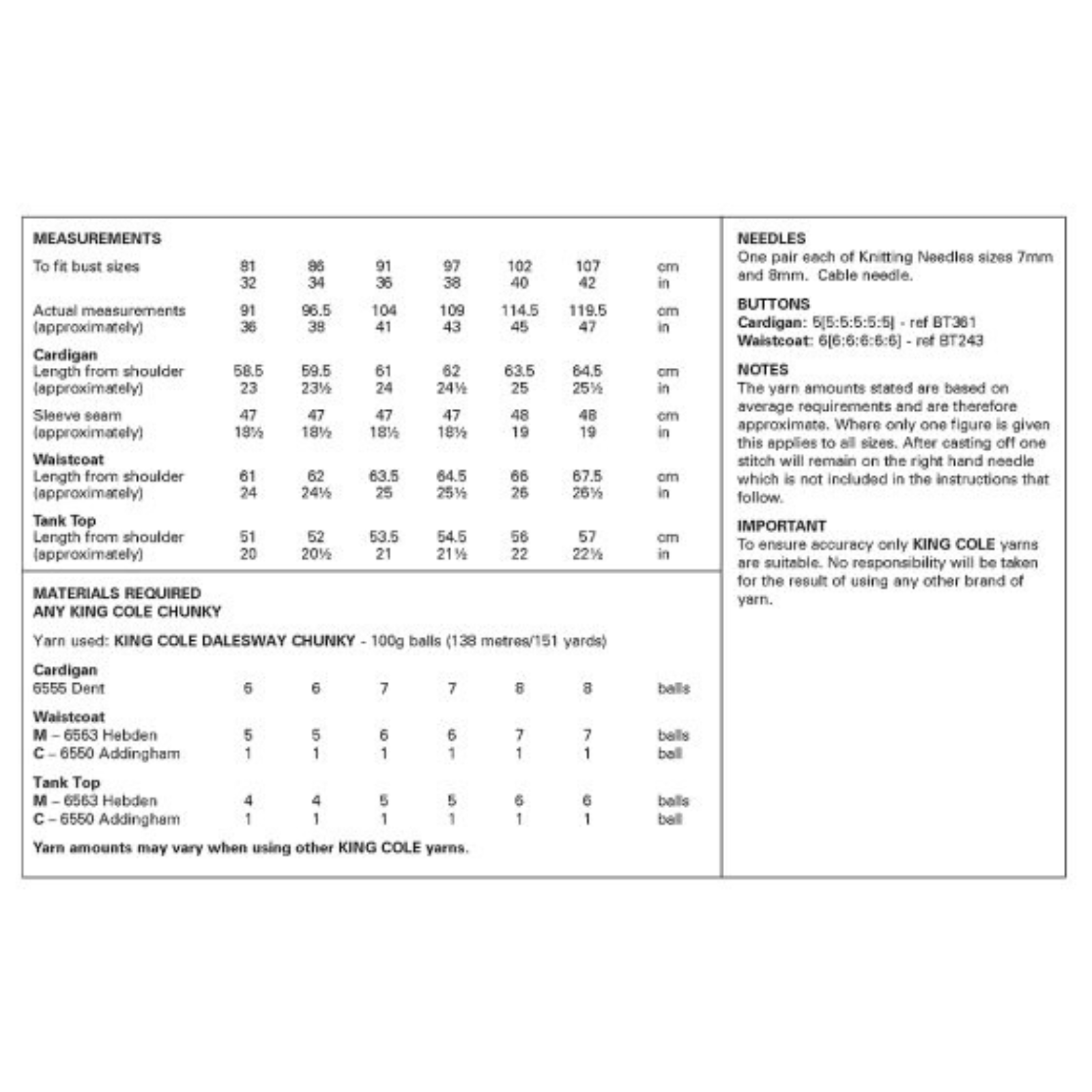 King Cole Pattern Ladies Cardigan, Waistcoat and Tank Top knitted in Dalesway Chunky 6412