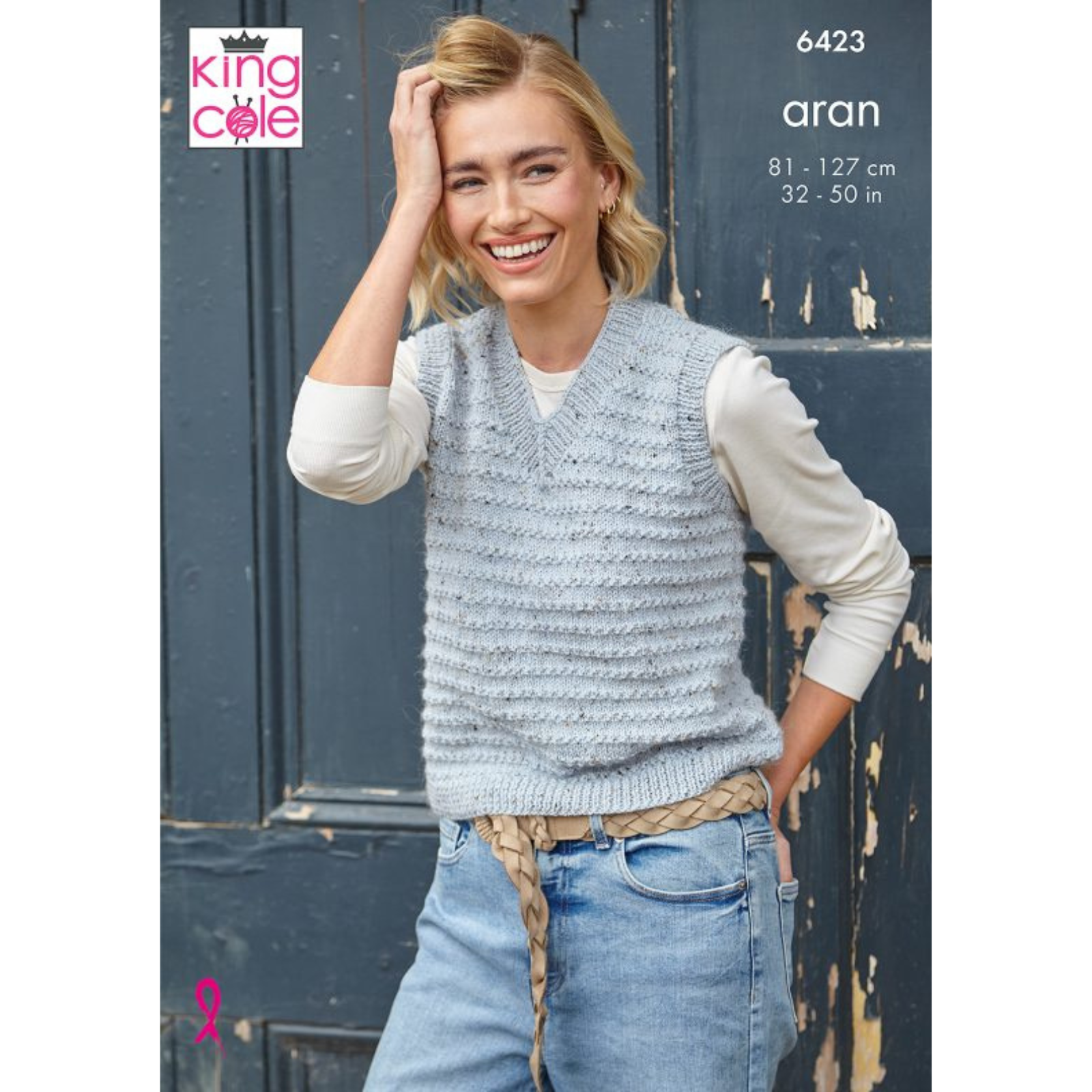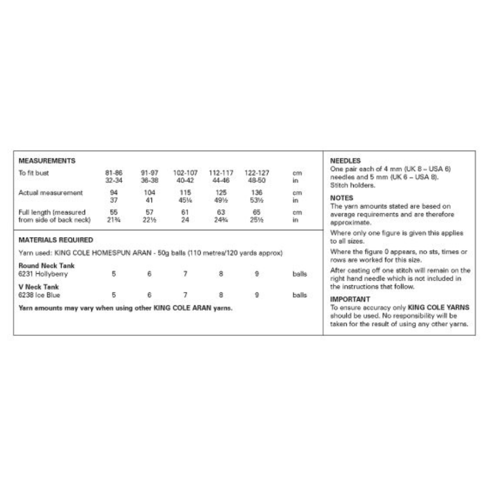 King Cole Pattern Ladies Round and V-Neck Tanks knitted in Homespun Aran 6423