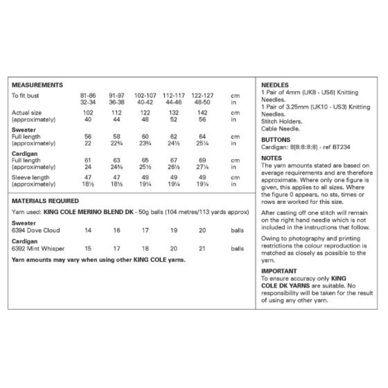 - Please see second image for suggested yarns, needle sizes and quantities required to make the garments