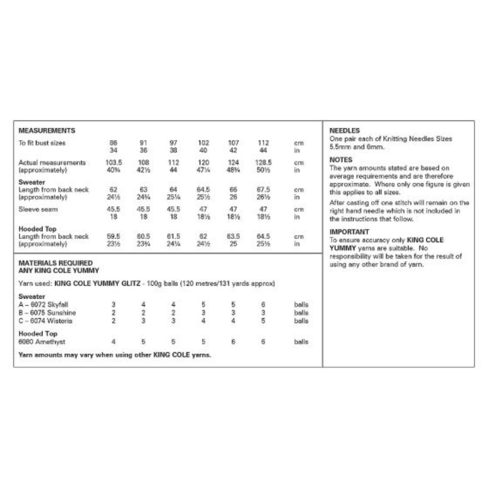 King Cole Pattern Ladies Sweater and Hooded Top knitted in Yummy Glitz 6393