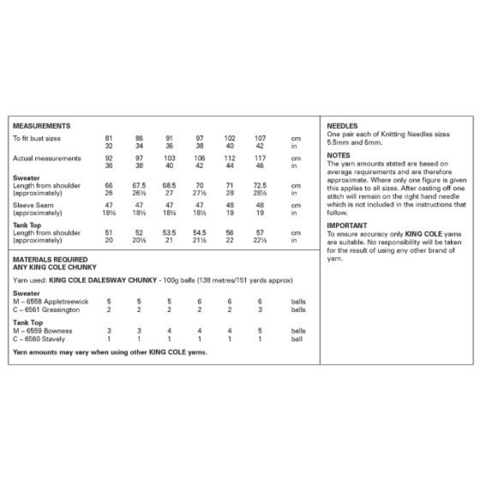 - Please see second image for suggested yarns, needle sizes and quantities required to make the garments