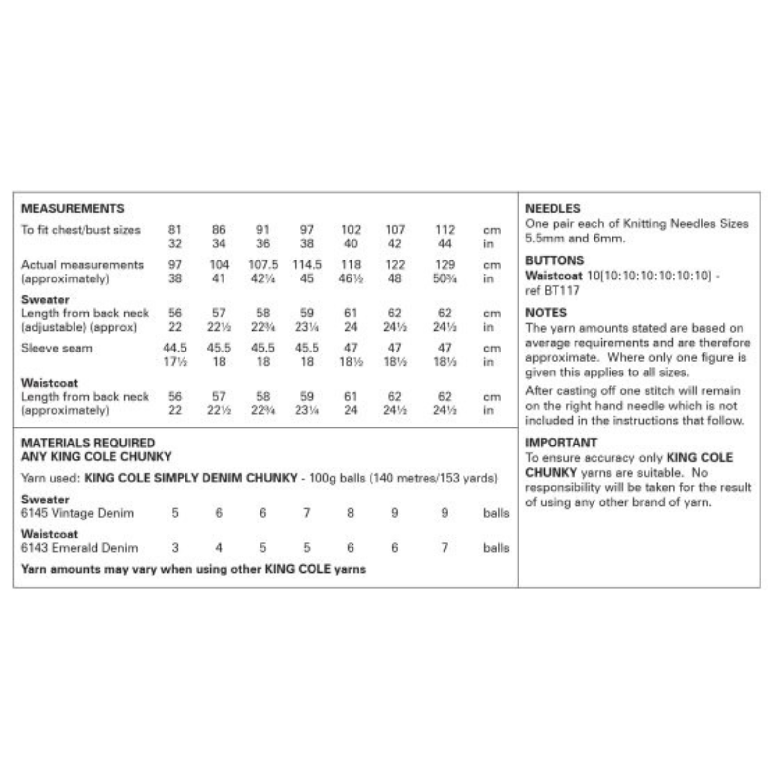 King Cole Pattern Ladies Sweater and Waistcoat knitted in Simply Denim Chunky 6377