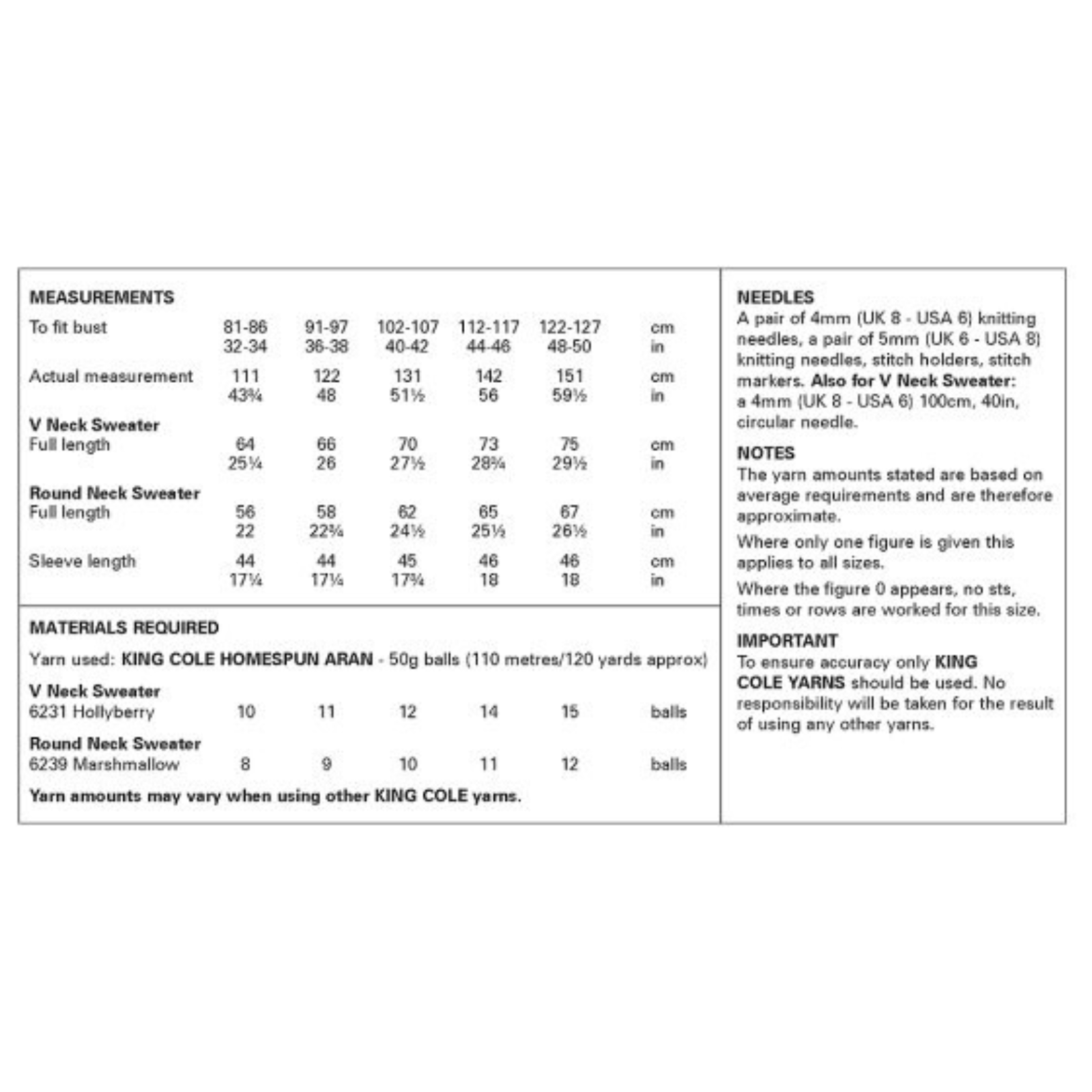 -Please see second image for suggested yarns, needle sizes and quantities required to make the garments