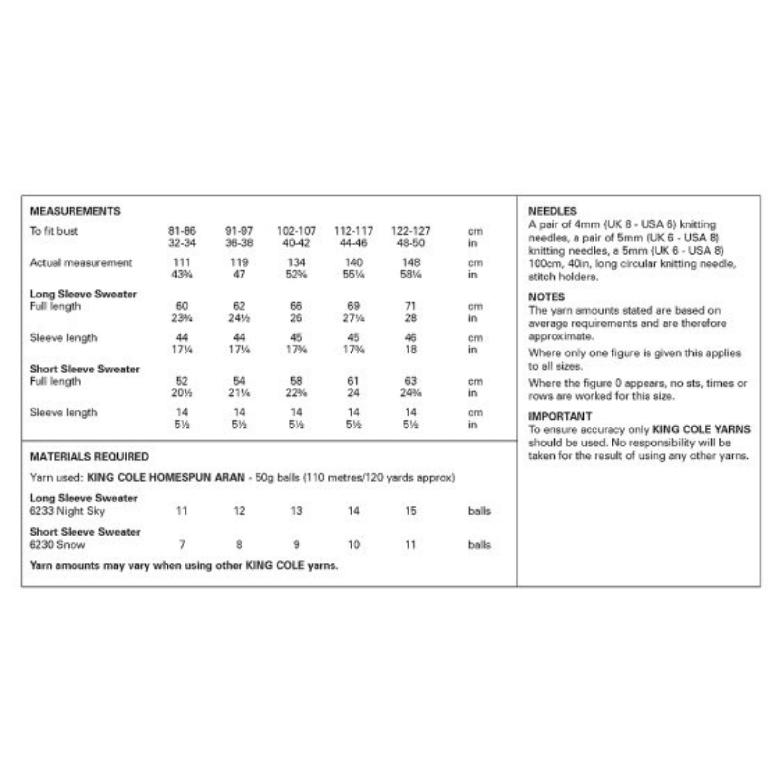 - Please see second image for suggested yarns, needle sizes and quantities required to make the garments