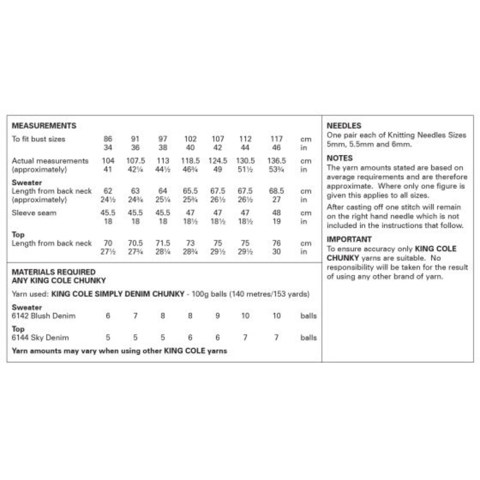 - Please see second image for suggested yarns, needle sizes and quantities required to make the garments