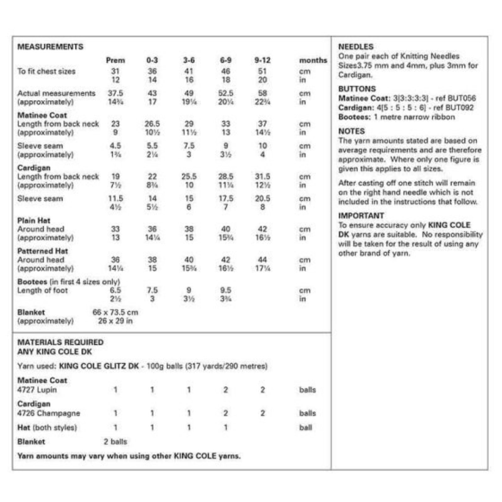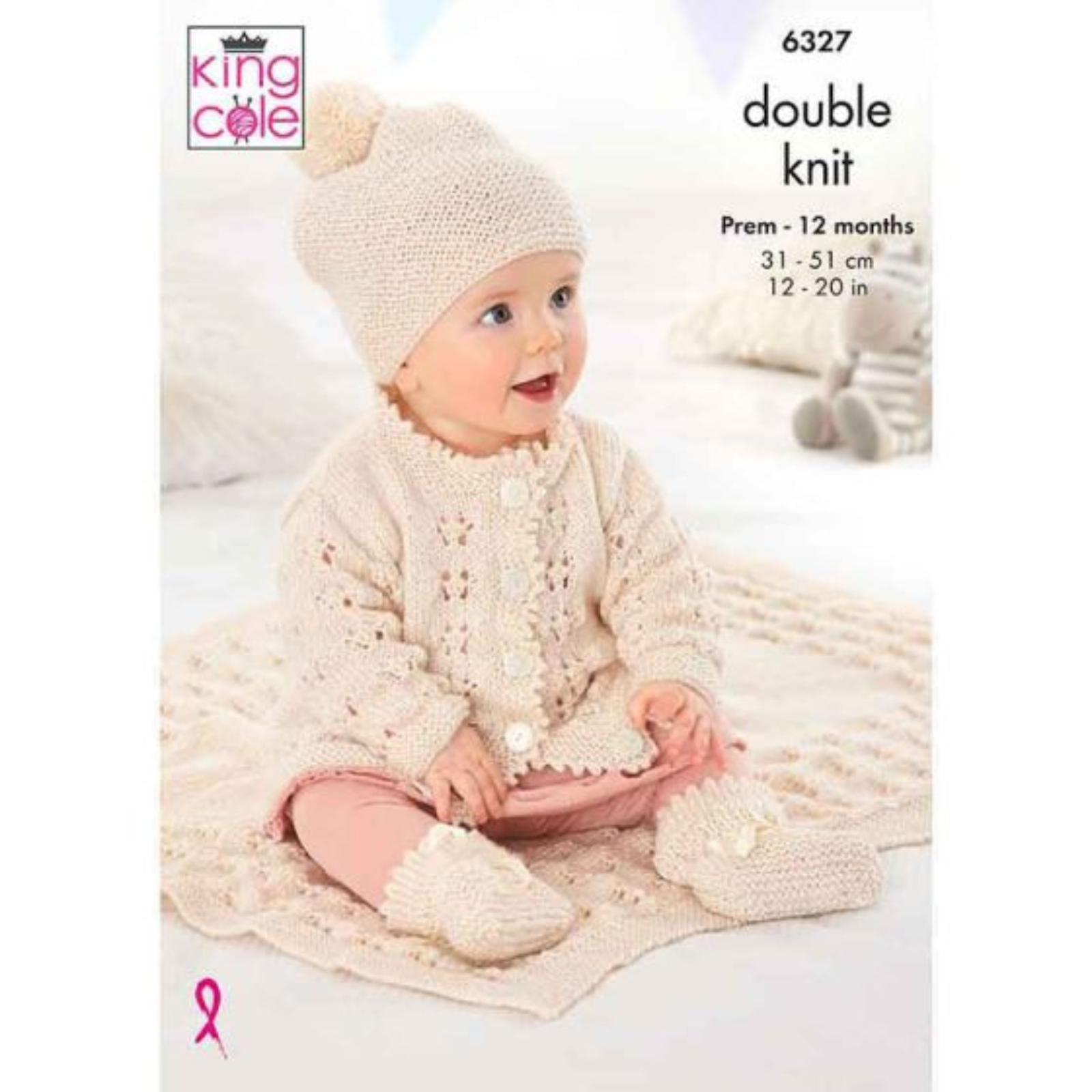 King Cole Pattern Matinee Coat, Cardigan, Hats, Bootees and Blanket knitted in Glitz DK 6327
