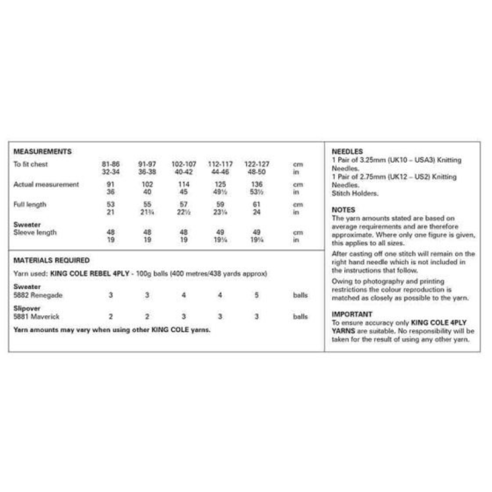 - Please see second image for suggested yarns, needle sizes and quantities required to make the garment