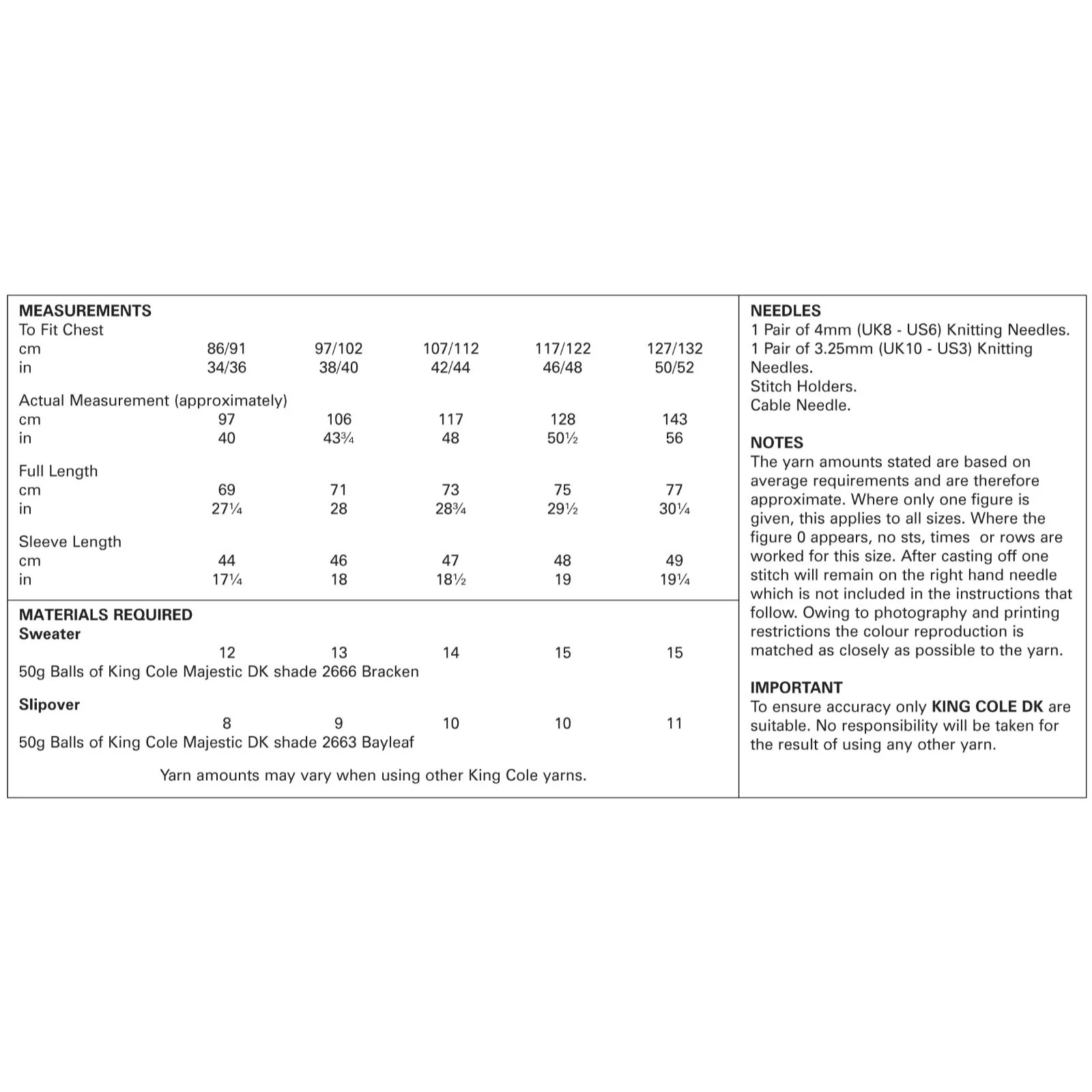 - Please see second image for suggested yarns, needle sizes and quantities required to make the garments