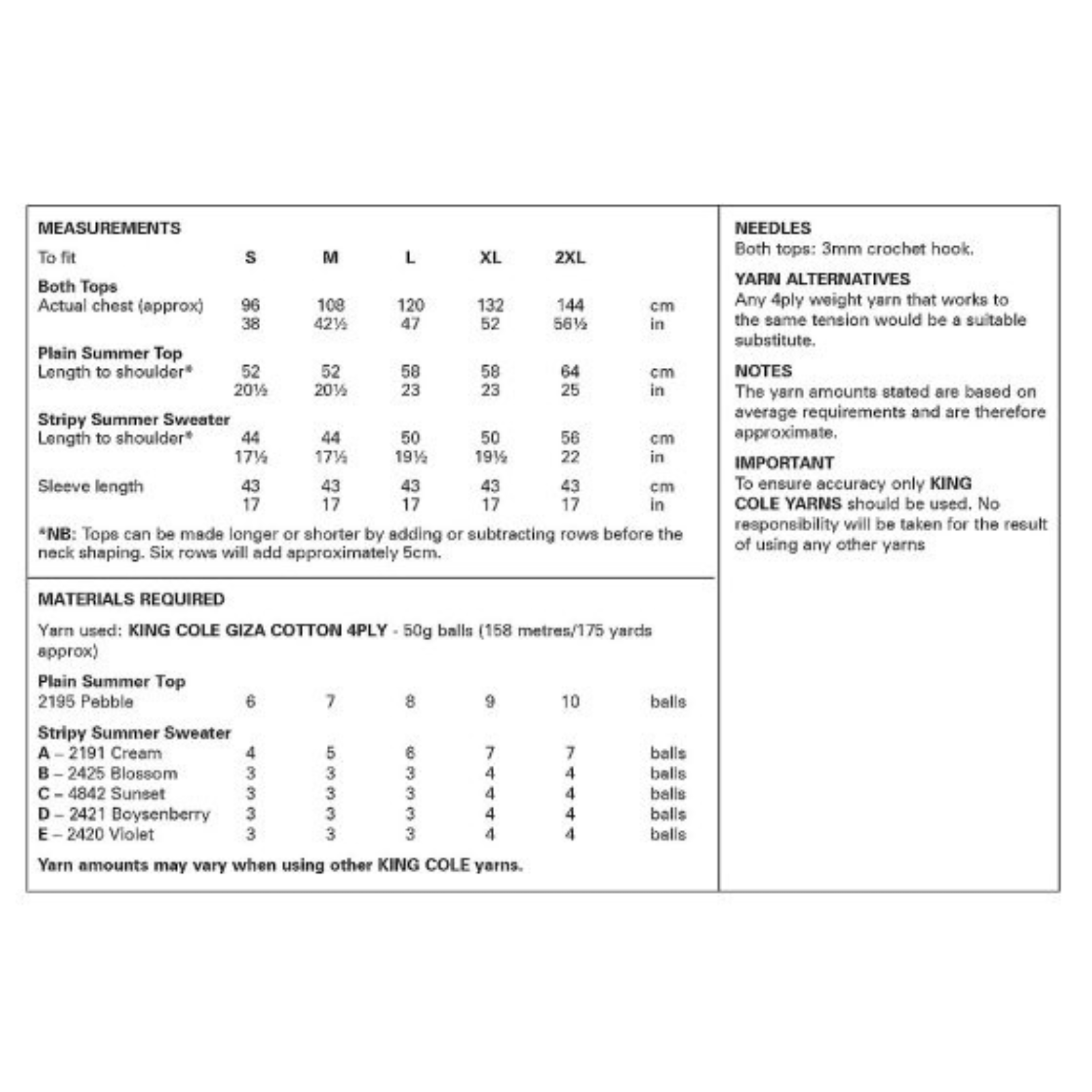 - Please see second image for suggested yarns, needle sizes and quantities required to make the garments