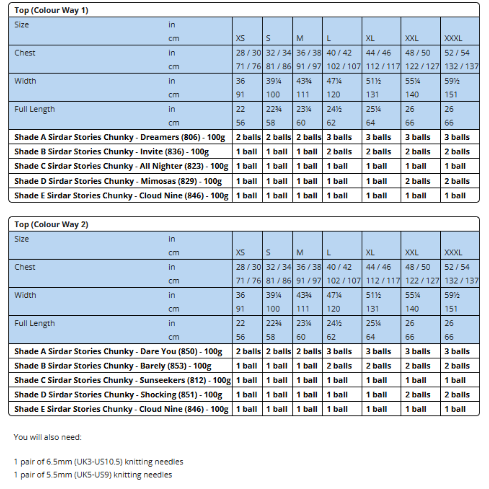 - Please see second image for suggested yarns, needle sizes and quantities required to make the garments
