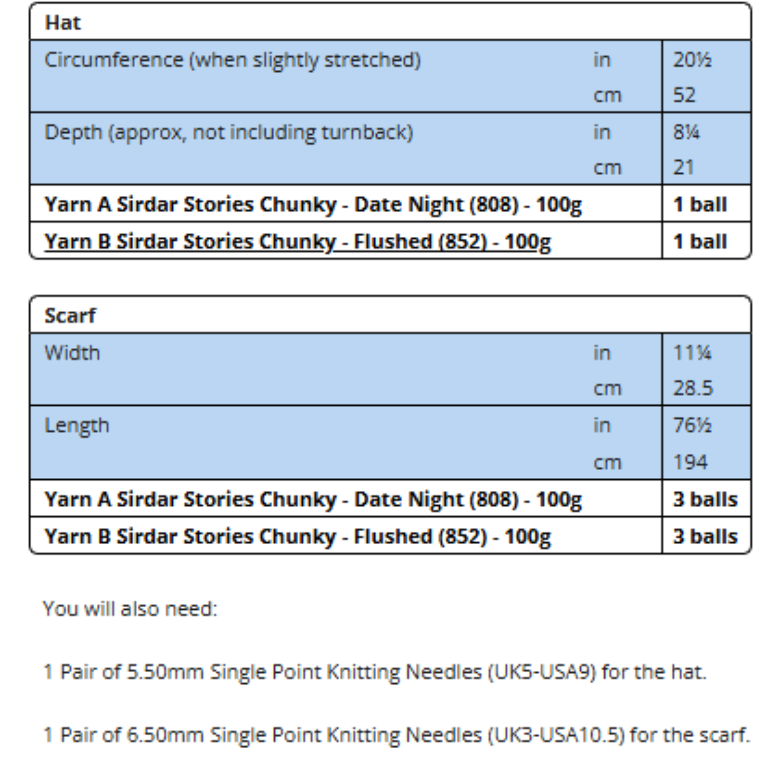 - Please see second image for suggested yarns, needle sizes and quantities required to make the garments