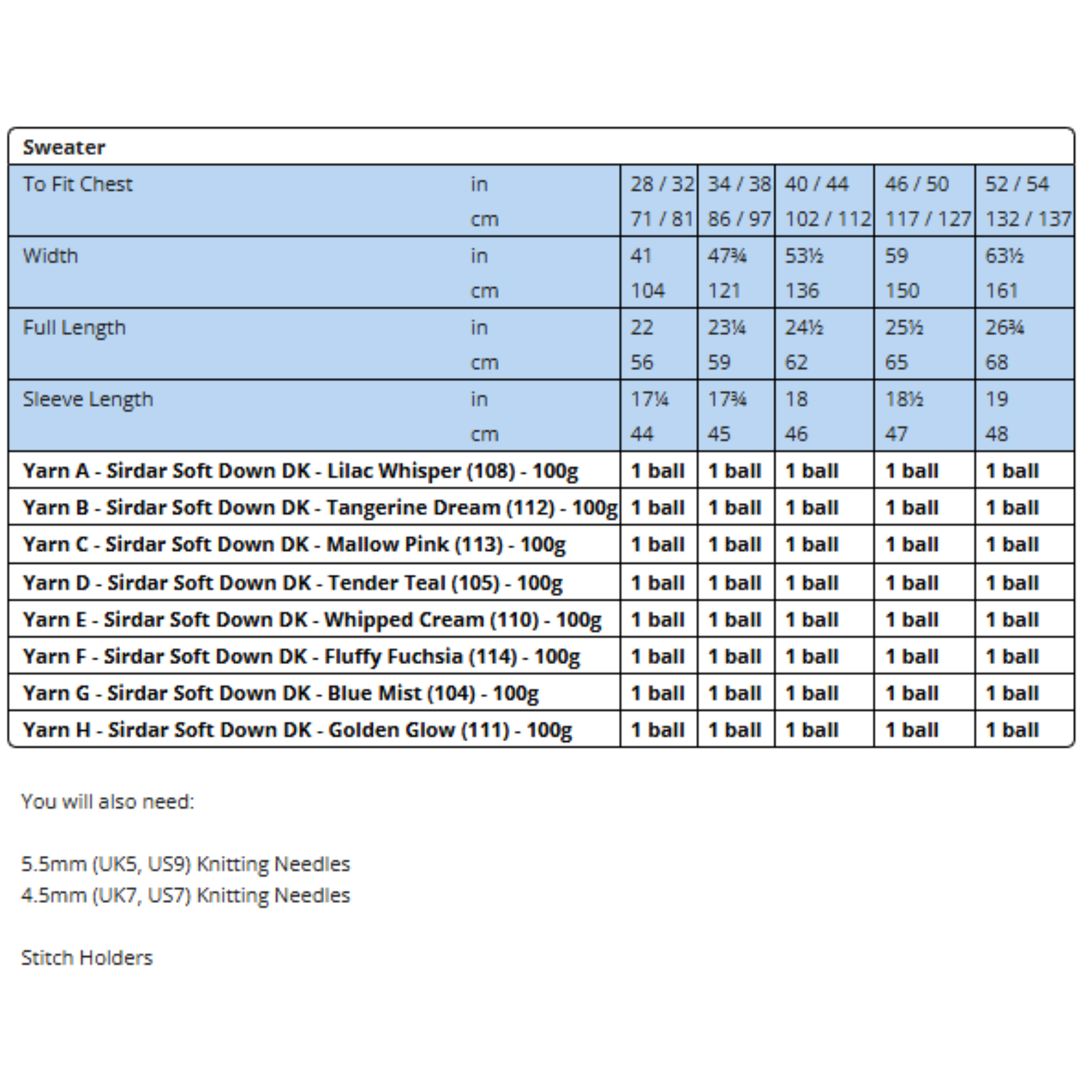 - Create the broad diagonal stripes in eight shades of Sirdar Soft Down using the intarsia technique and clever colour-matching from the body into the drop sleeves for an elegant seamless effect