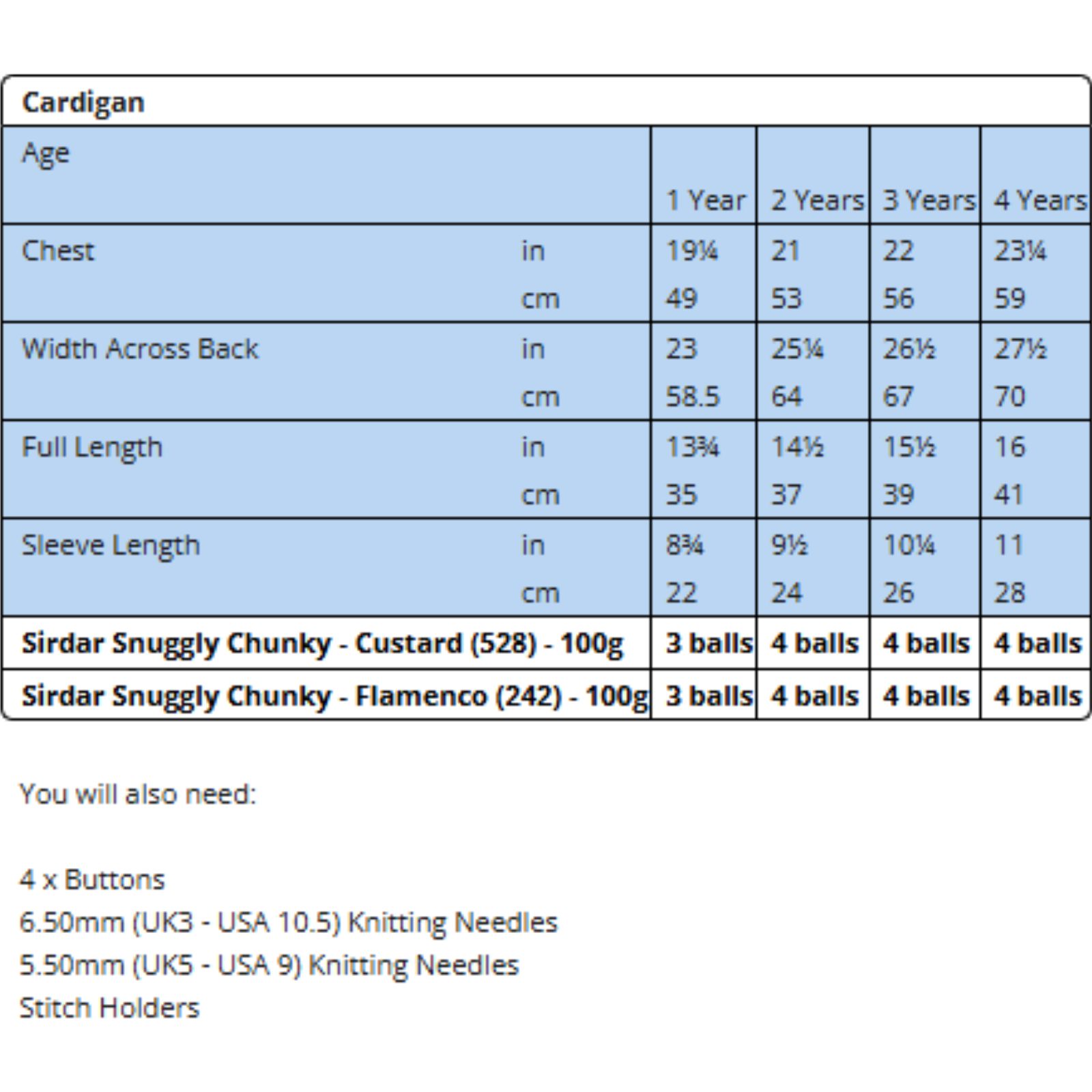 - Please see second image for suggested yarns, needle sizes and quantities required to make the garments