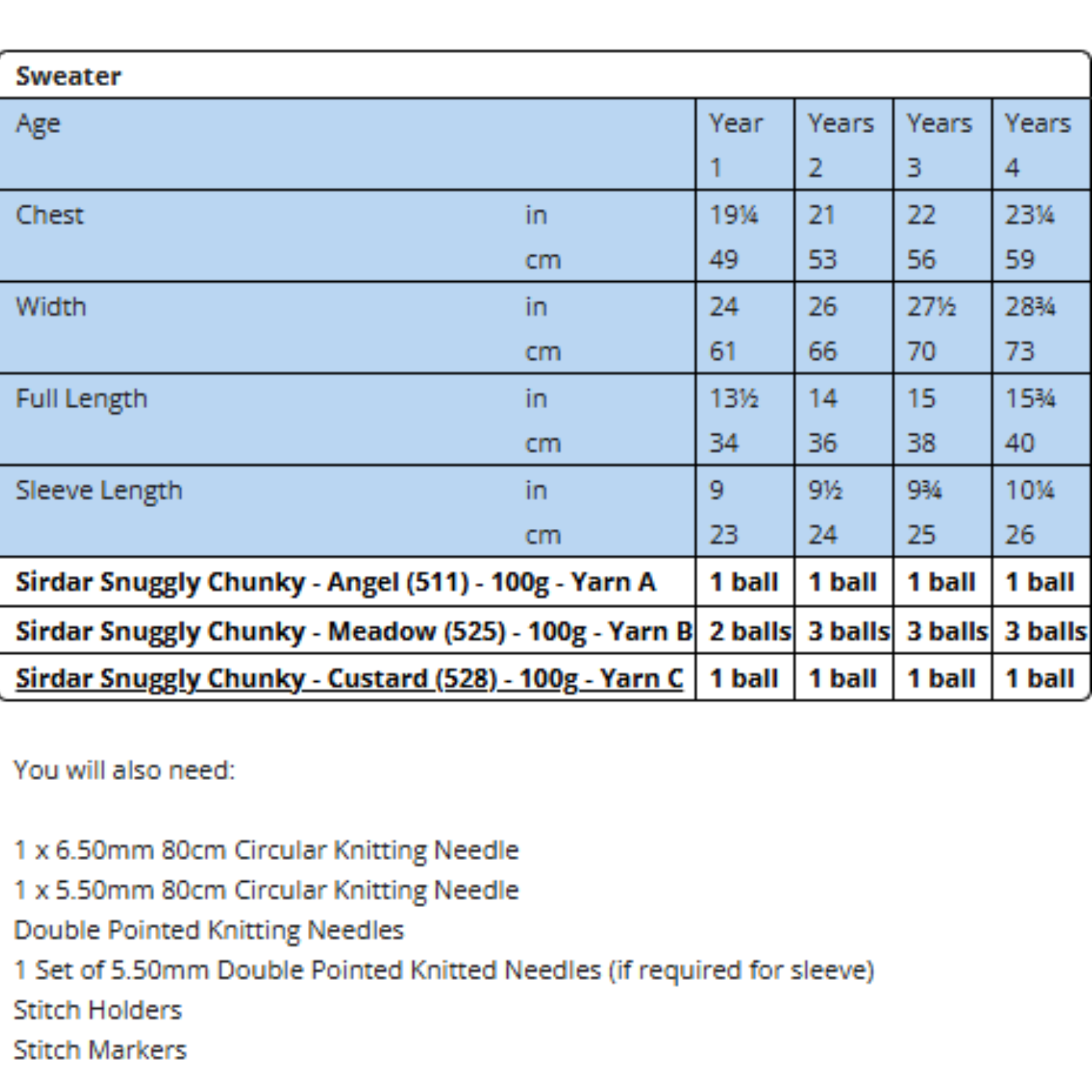 - Please see second image for suggested yarns, needle sizes and quantities required to make the garments