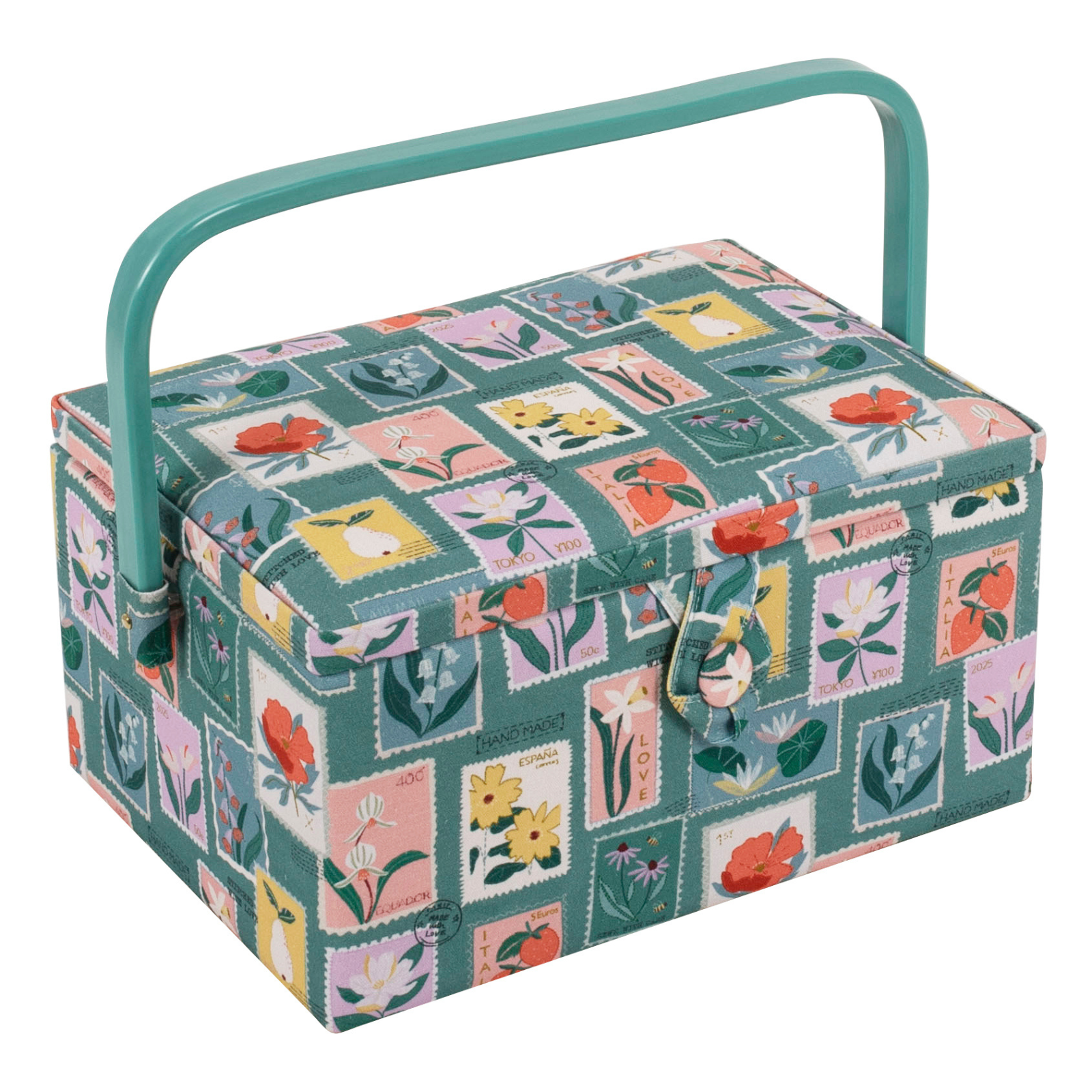 - Medium sewing box made from cotton fabric in a modern embroidered stamps print