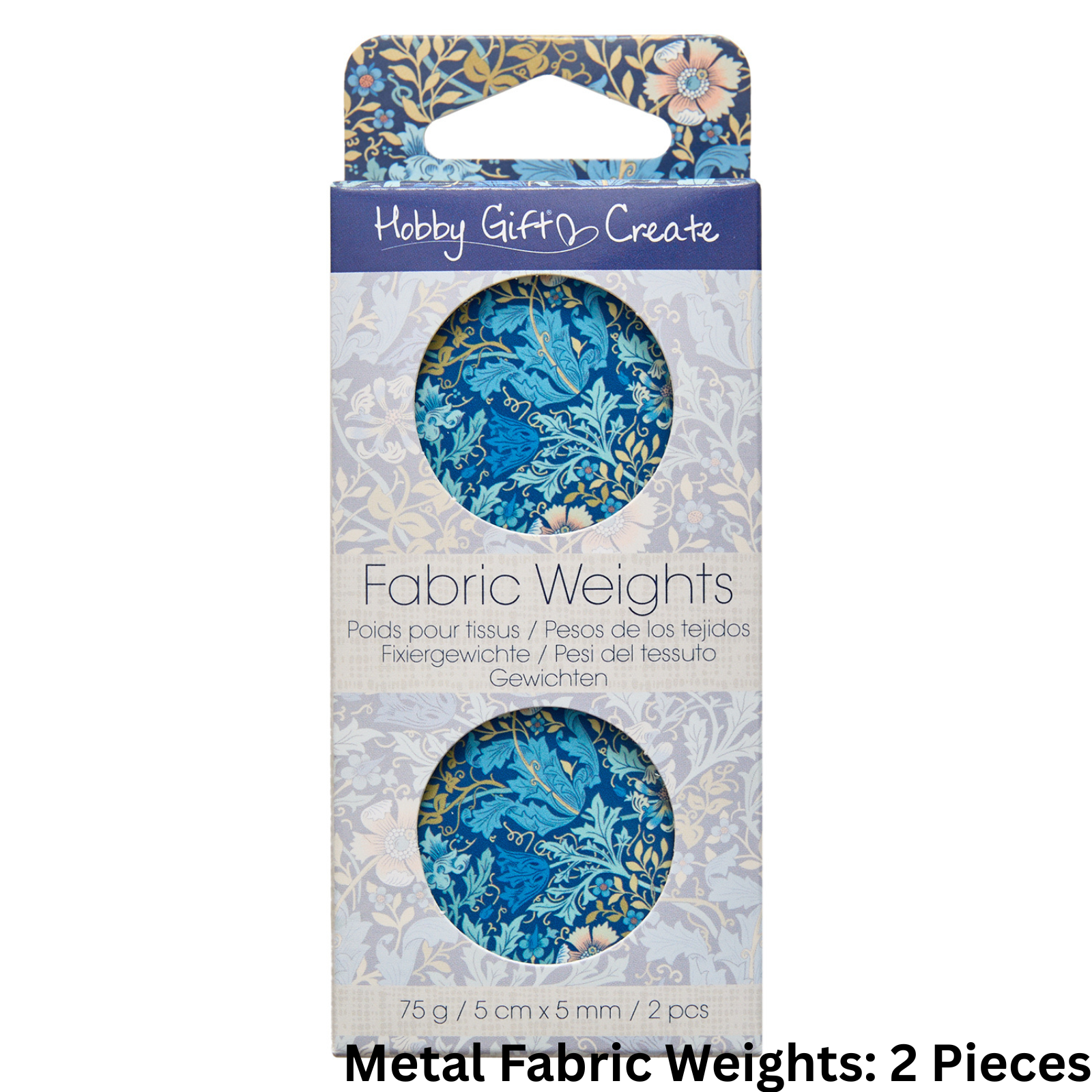 Metal fabric weights with woodblock Arts & Crafts inspired printed design on both sides