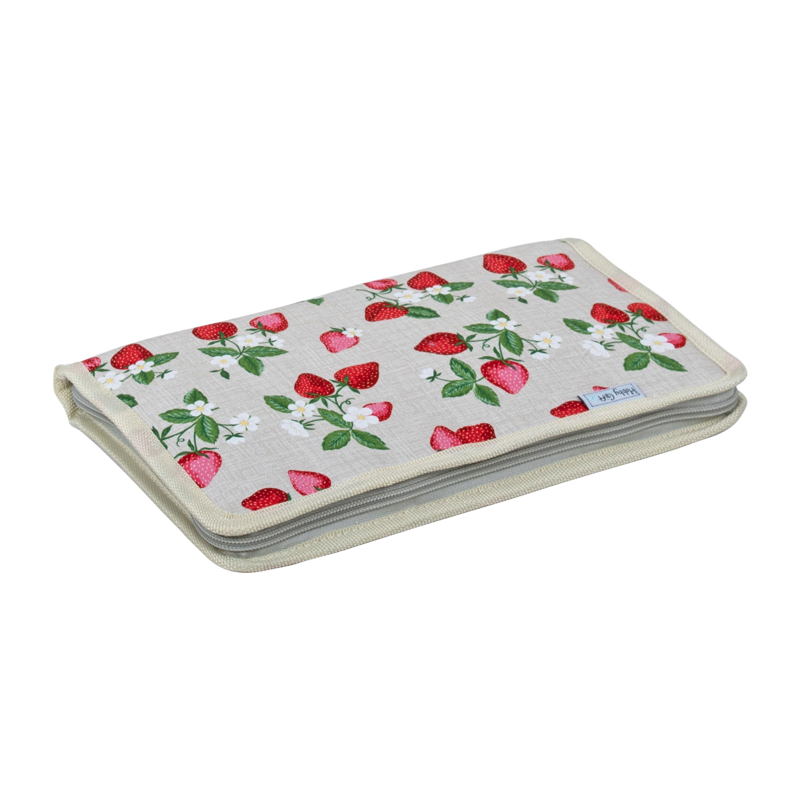 - Zippered interchangeable knitting case covered in 100% cotton fabric in a Natural Strawberries print