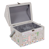 - Novelty shop-shaped sewing box covered in a linen fabric with a Haby Notions design