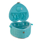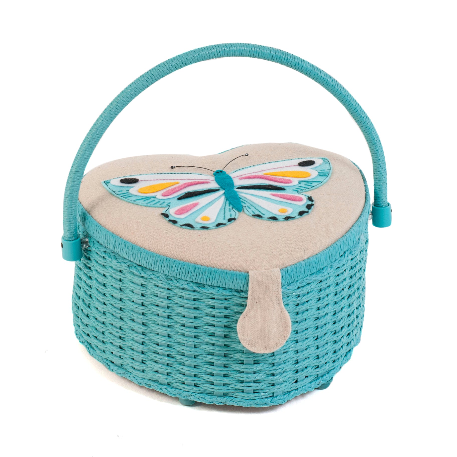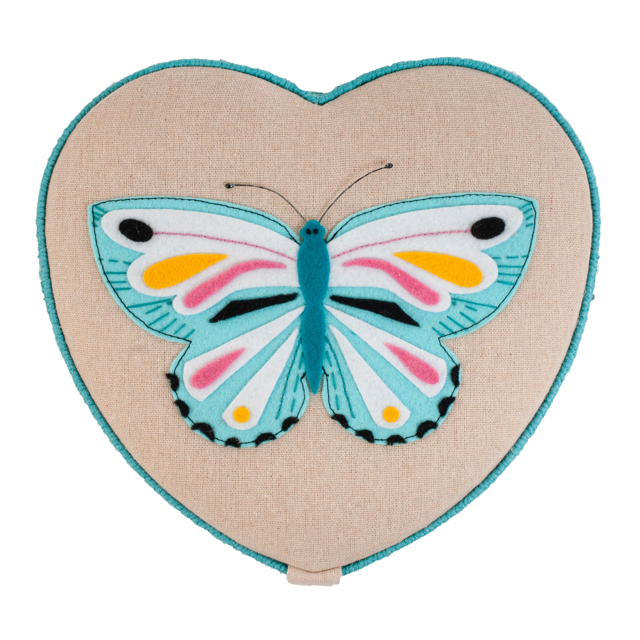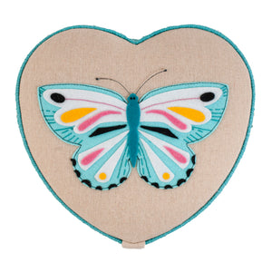 - Medium-sized, heart shaped sewing box covered in 100% cotton fabric in a Flutterby print, with appliqué design