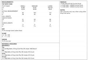 Crochet pattern by King Cole - Leaflet 4763.Top with yoke plus accessories in Riot DK.Pattern features (finished sizes): 32"-42" (81cm-107cm).Pattern requires: 1-3 balls Riot DK.Please also see the second image for garment/item sizes and number of balls/needles required.This pattern is suitable with most DK/Chunky wool but we recommend making a tension square prior to knitting.Please note: this is for the pattern and not the finished product.We do not fold our patterns and all patterns are sent in board-backed envelopes.