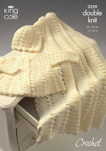 King Cole Crochet Pattern Baby Coat, Shawl & Hat- DK 3259