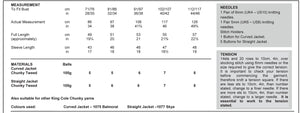 Knitting pattern by King Cole - Leaflet 4033.2 styles cardigan in Chunky Tweed yarn.Pattern features (finished sizes): Bust 28"-46" (71cm-117cm).Pattern requires: 5-8 100g balls Chunky Tweed yarn.Please also see the second image for garment/item sizes and number of balls/needles required.This pattern is suitable with most other chunky wool but we recommend making a tension square prior to knitting.Please note: this is for the pattern and not the finished product.We do not fold our patterns and all patterns are sent in board-backed envelopes.