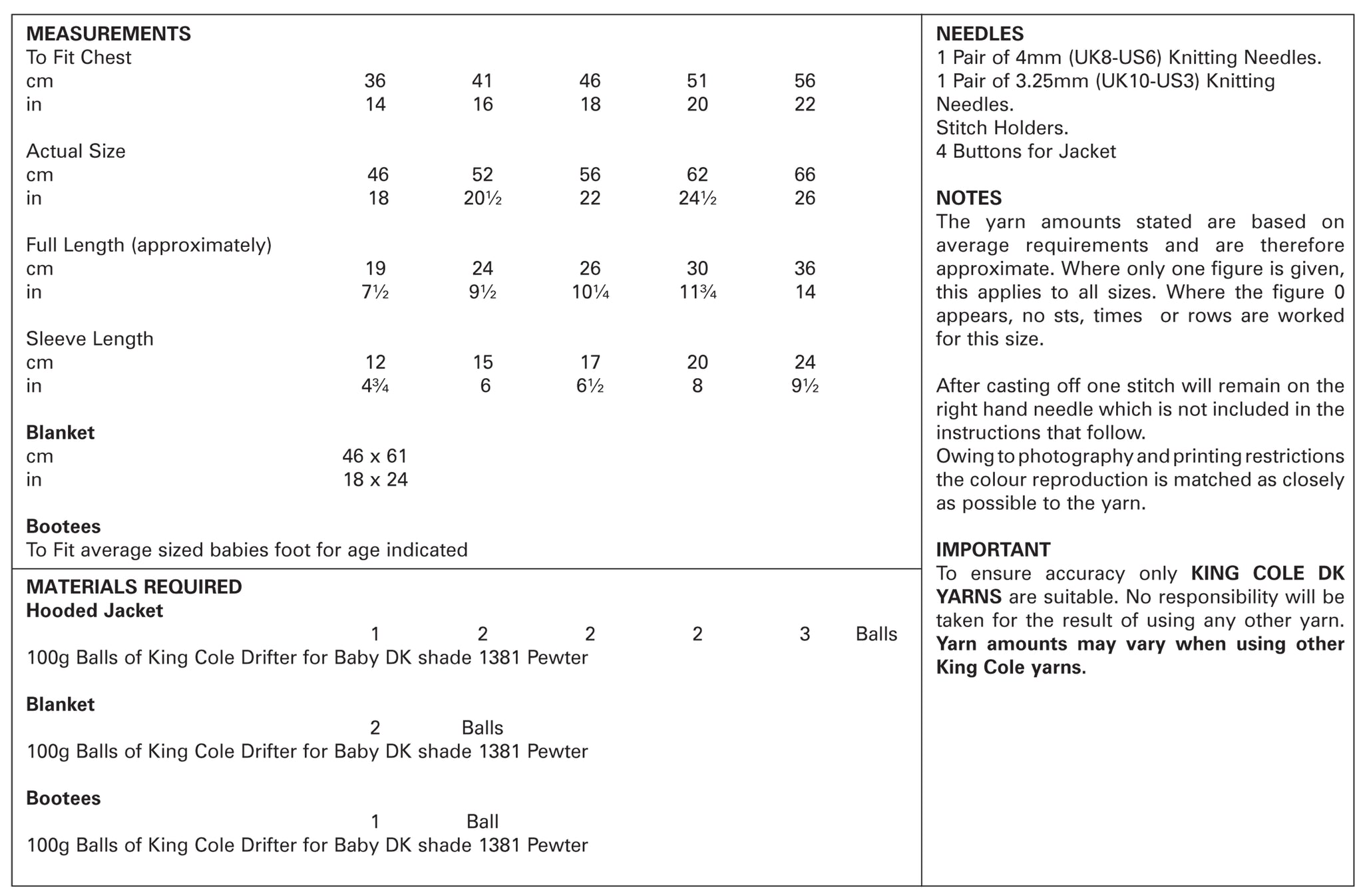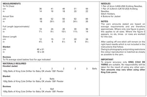 Knitting pattern by King Cole - Leaflet 4487.Baby's hooded jacket, blanket , and bootees in DK Baby wool.Pattern features (finished sizes): Jacket; 14"-22" (36cm-56cm)Pattern requires: 1-3x 100g balls.Please also see the second image for garment/item sizes and number of balls/needles required.This pattern is suitable with most DK Baby wool but we recommend making a tension square prior to knitting.Please note: this is for the pattern and not the finished product.We do not fold our patterns and all patterns are sent in board-backed envelopes.