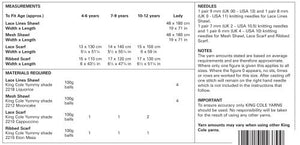 Ladies shawl; 5.25"x 51.25" (13cmx 130cm) and 19"x 71" (15cmx 150cm)Pattern requires: 1-4x 100g balls Yummy.Please also see the second image for garment/item sizes and number of balls/needles required.This pattern is suitable with Yummy wool. We recommend making a tension square prior to knitting.Please note: this is for the pattern and not the finished product.We do not fold our patterns and all patterns are sent in board-backed envelopes.