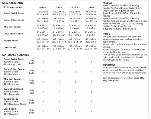 Knitting pattern by King Cole - Leaflet 4541.Childs and ladies snood - 6 different stitch types in Yummy.Pattern features (finished sizes): Childs; 4-12 years.