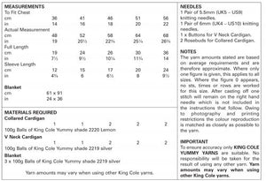 Collared cardigan; 1-2x 100g balls Yummy & 2x rosebuds. Blanket; 3x 100g balls Yummy.Please also see the second image for garment/item sizes and number of balls/needles required.This pattern is suitable with Yummy wool, we recommend making a tension square prior to knitting.Please note: this is for the pattern and not the finished product.We do not fold our patterns and all patterns are sent in board-backed envelopes.