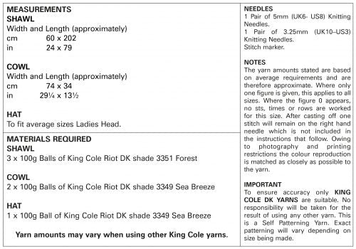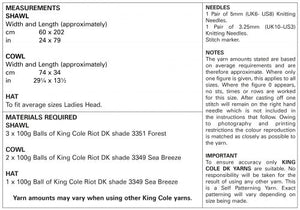Knitting pattern by King Cole - Leaflet 5400.Ladies shawl, cowl, and hat.Pattern features (finished sizes): Shawl; 24"x 79" (60cmx 202cm).